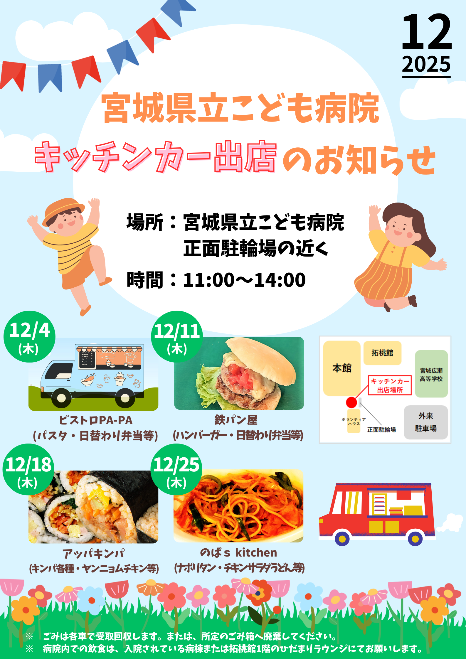 お知らせ キッチンカーの出店について(12月分) 2025年12月01日 12月のキッチンカー出店情報をお知らせします。 皆さま、ぜひご利用ください! 地域医療研修会 オンライン月イチセミナー『麻酔科』を開催します 前の記事 患者・家族と語る成人移行支援の会を開催します 次の記事